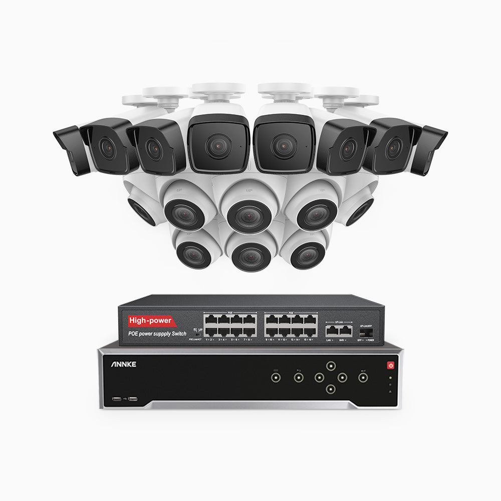 H500 - 3K 32 Channel PoE Security System with 8 Bullet & 8 Turret Cameras, EXIR 2.0 Night Vision, Built-in Mic & SD Card Slot, Works with Alexa, 16-Port PoE Switch Included ,IP67 Waterproof, RTSP Supported