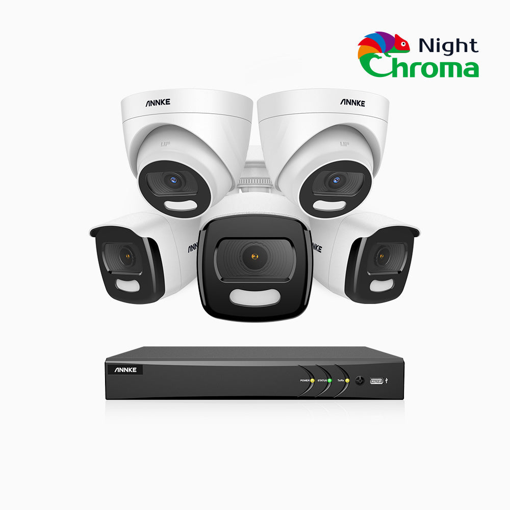 NightChromaTM NCK500 - 3K 8 Channel PoE Security System with 3 Bullet & 2 Turret Cameras, Acme Color Night Vision, f/1.0 Super Aperture, Active Alignment, Built-in Microphone, IP67 , All-Metal Housing