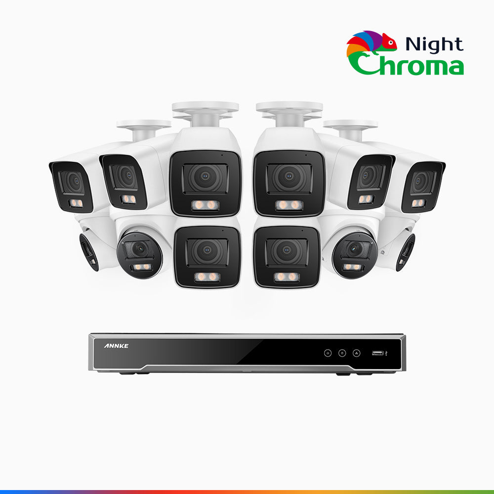NightChromaTM NCK800 – 4K 16 Channel PoE Security System with 8 Bullet & 4 Turret Cameras, f/1.0 Super Aperture, Color Night Vision, 2CH 4K Decoding Capability, Human & Vehicle Detection, Intelligent Behavior Analysis, Built-in Mic, 124° FoV